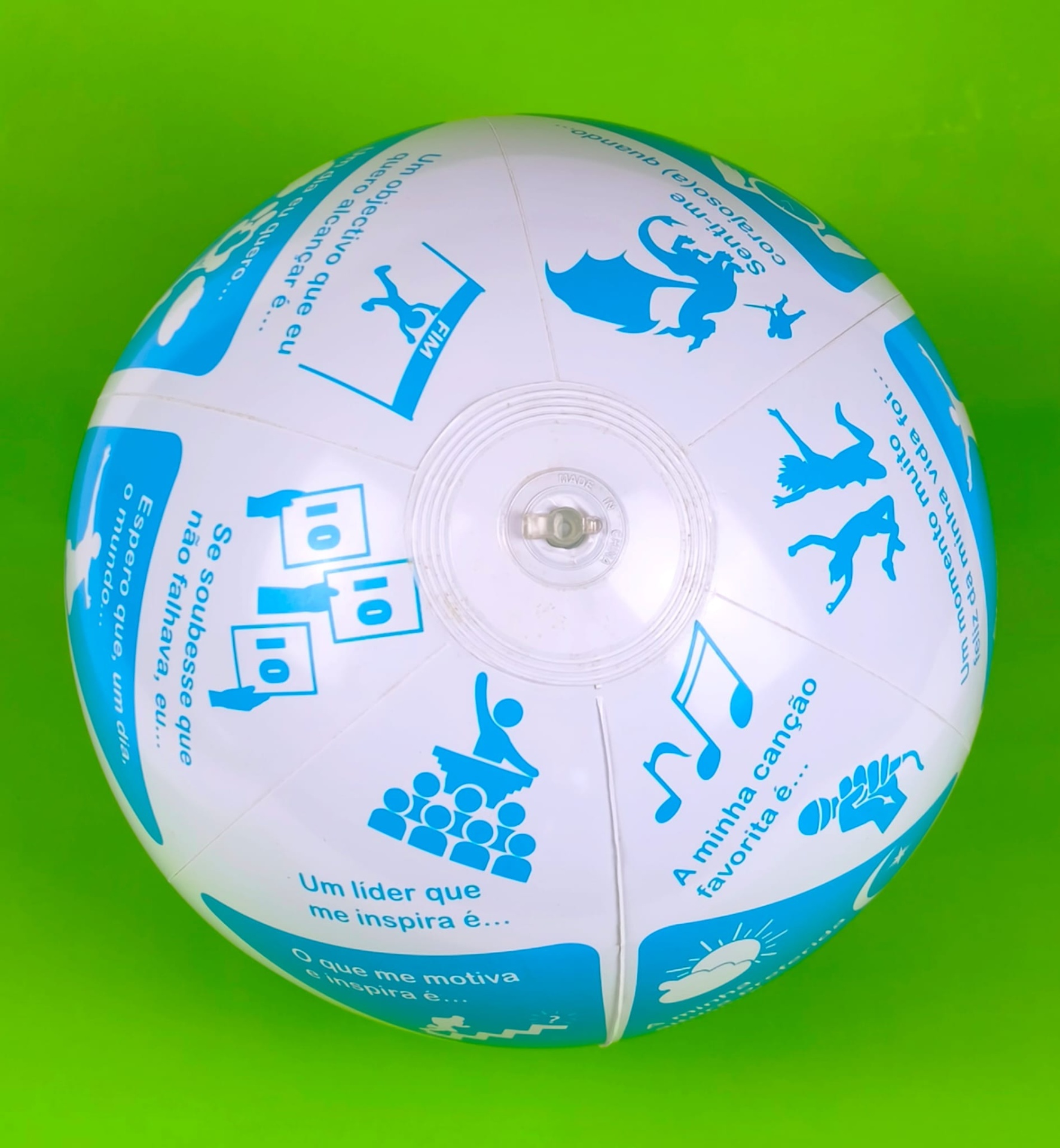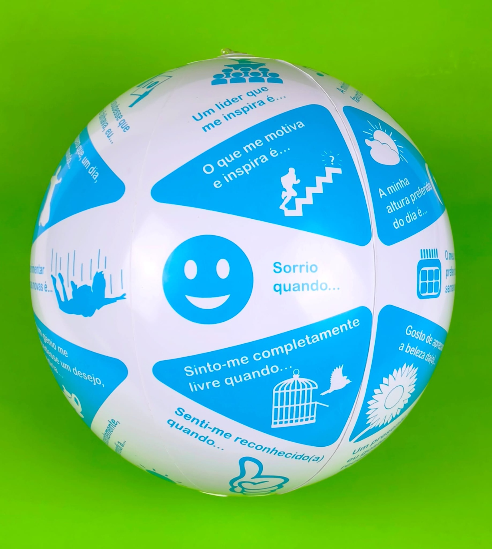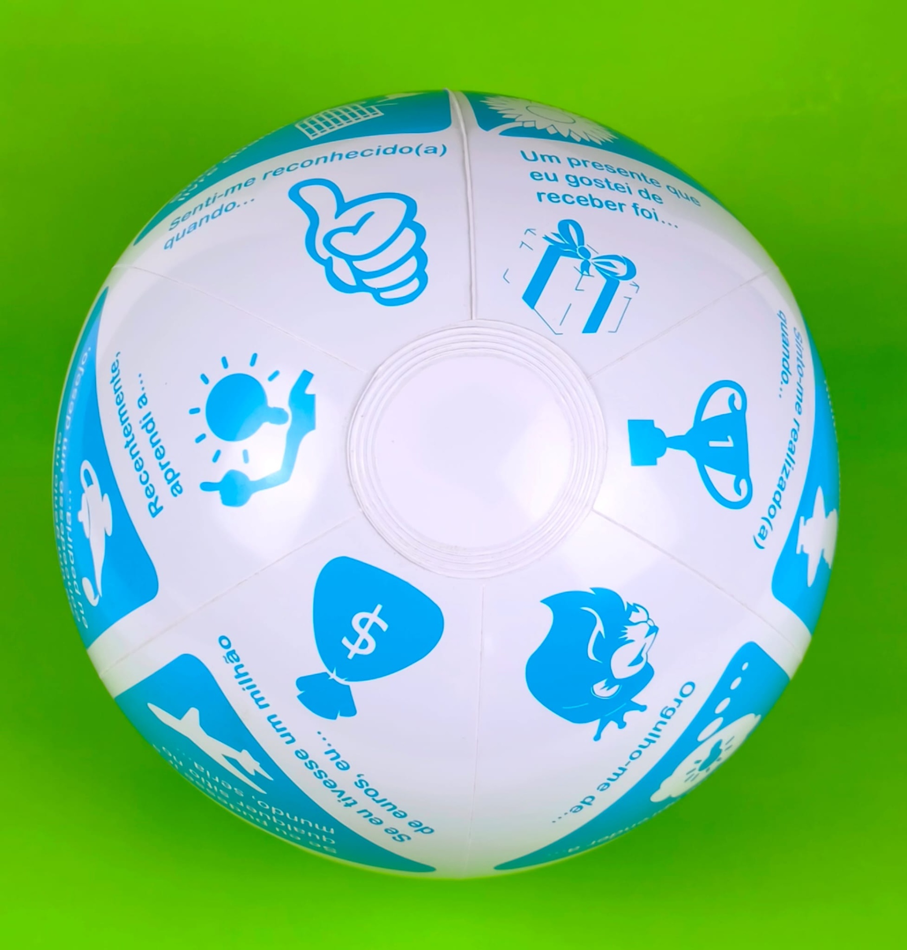 - Bola insuflável com 30cm de diâmetro, com 30 frases impressas na sua superfície;