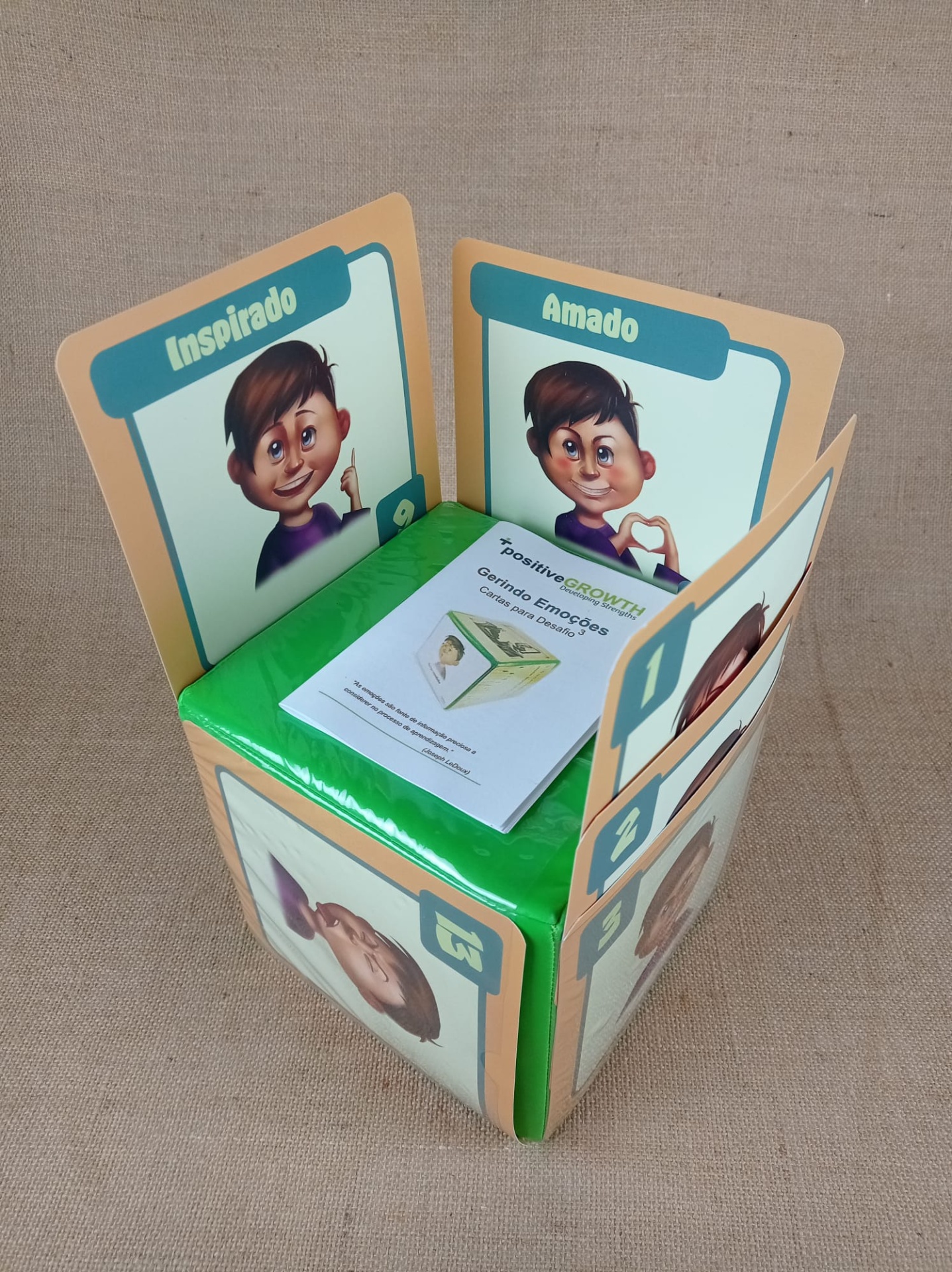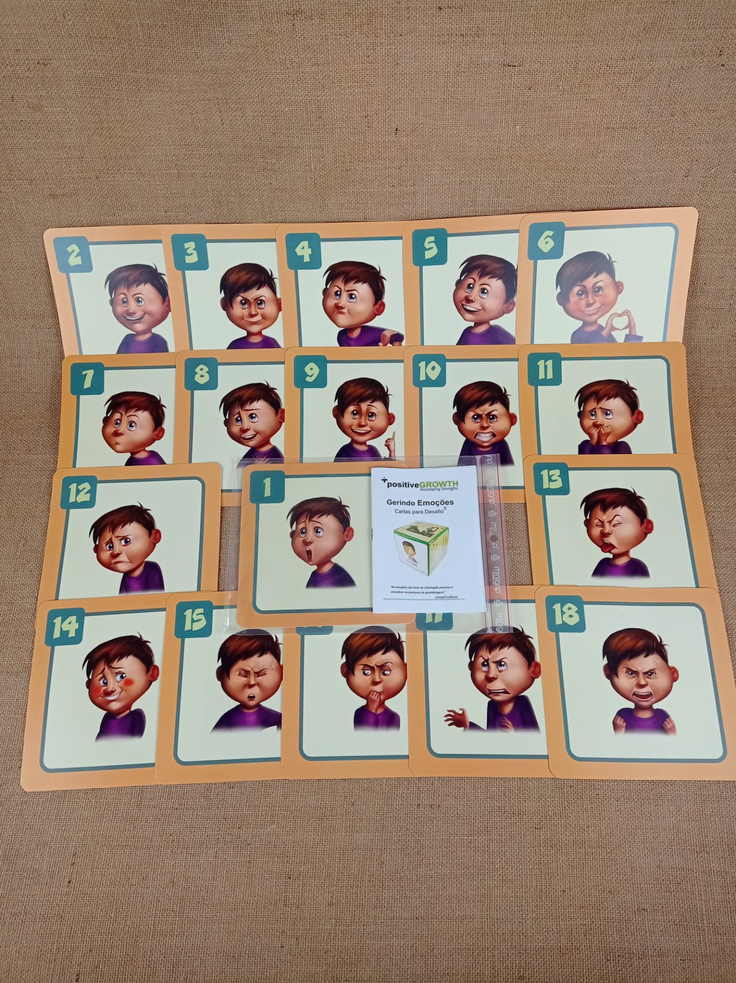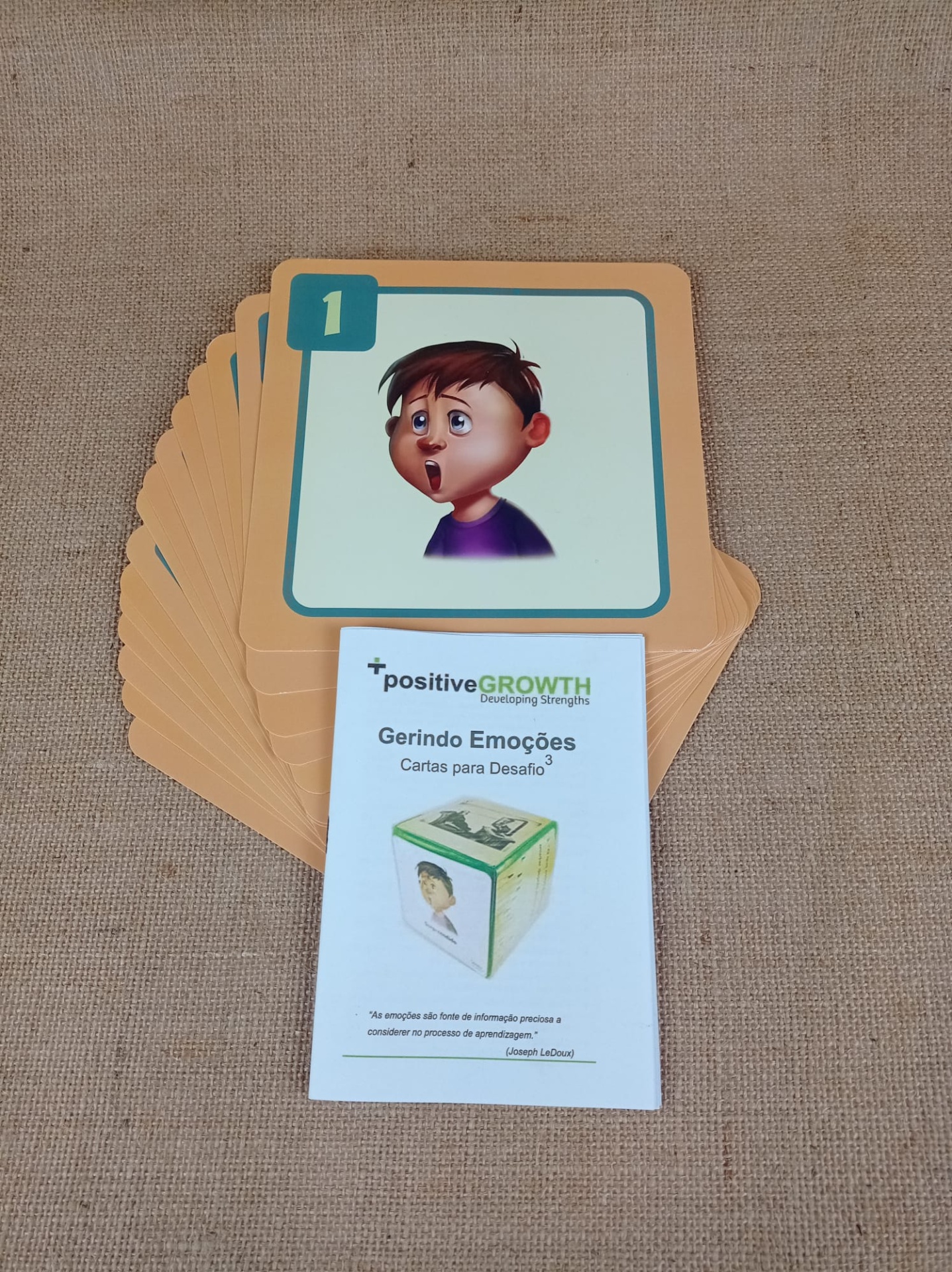 As Cartas Gerindo Emoções (com a dimensão 16,9 X 16,6 cm) são um conjunto de 18 cartas, impressas em ambos os lados, para usar com o Desafio ao Cubo.
