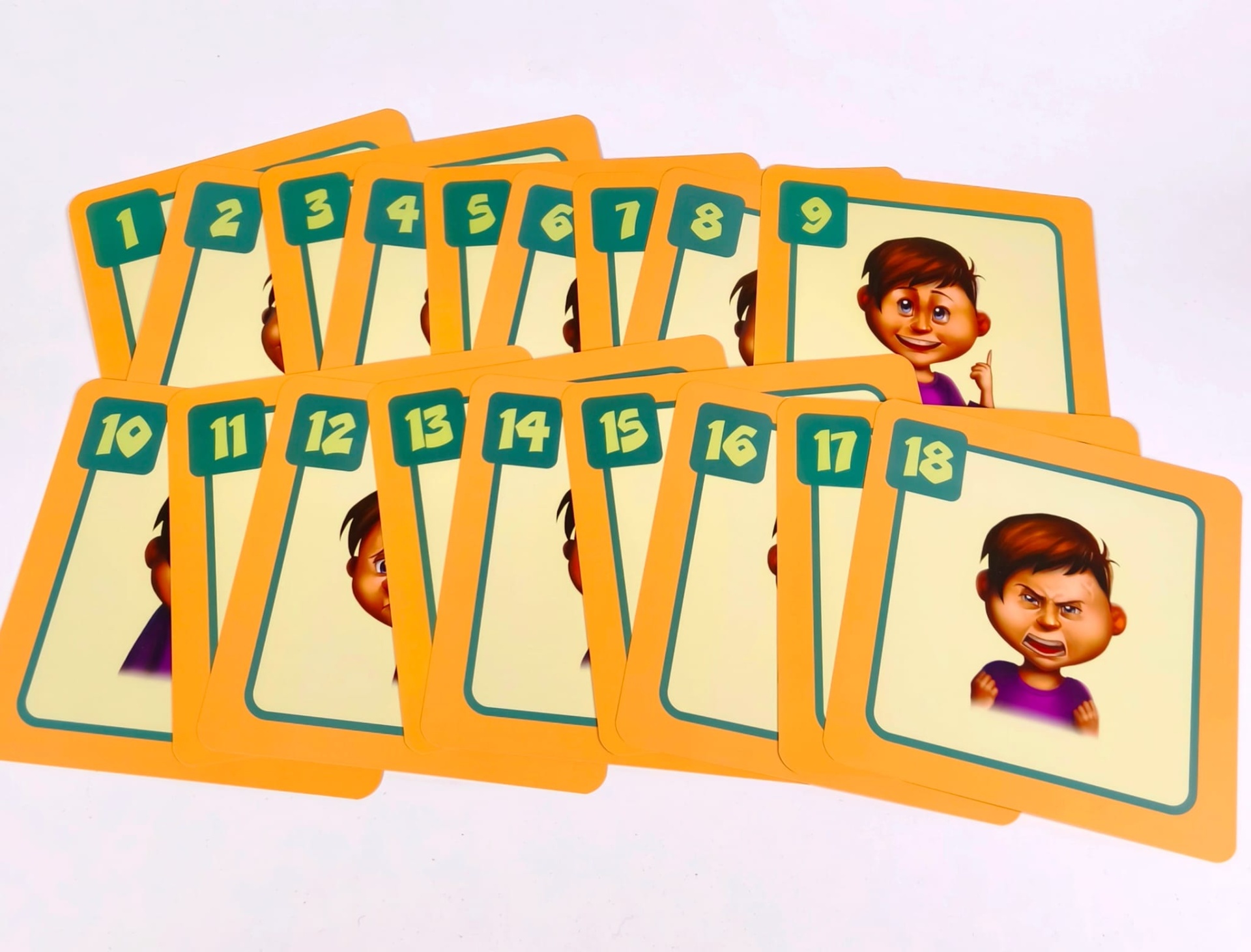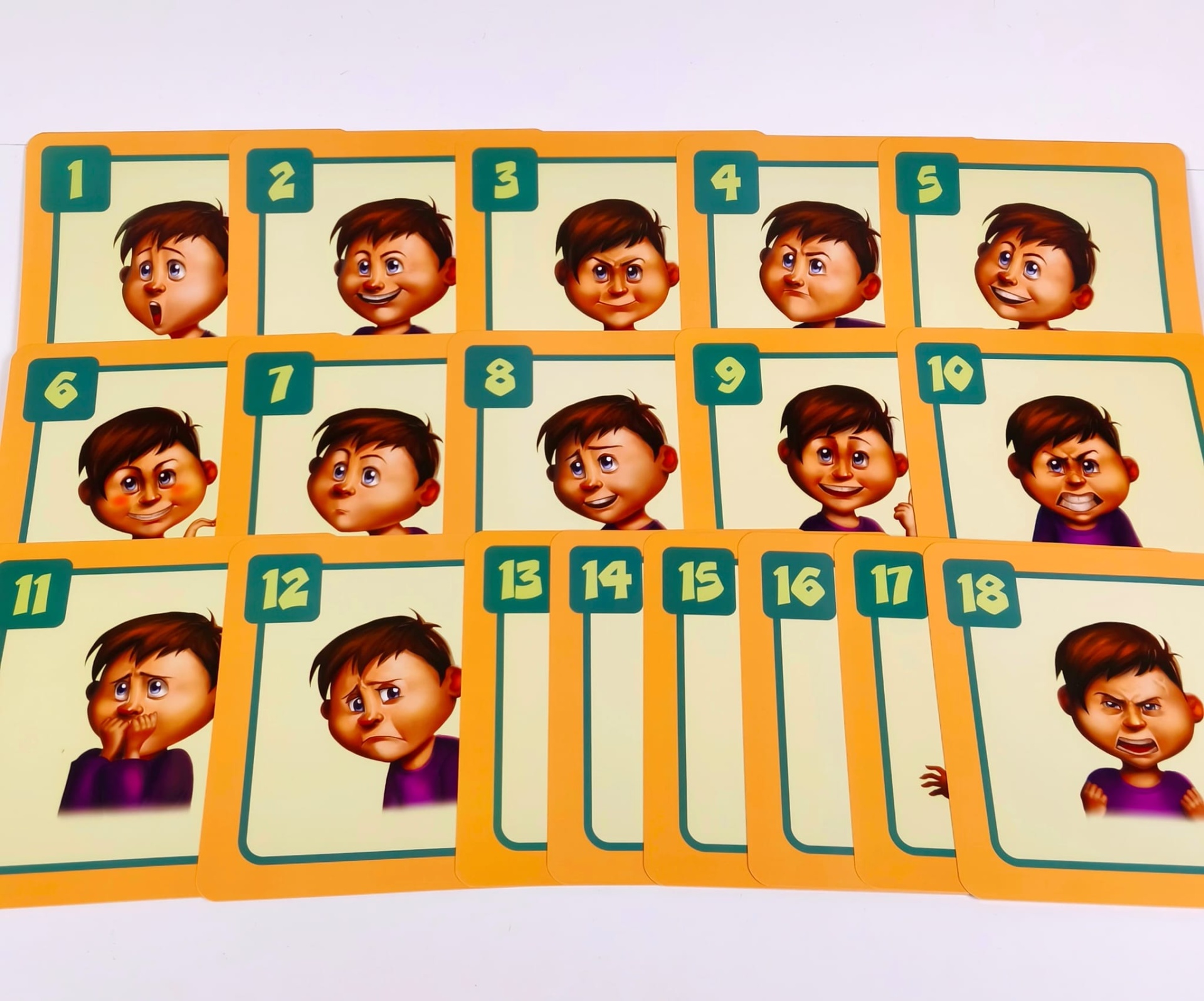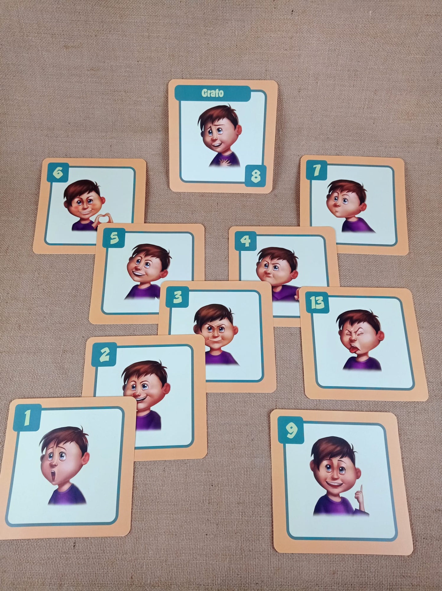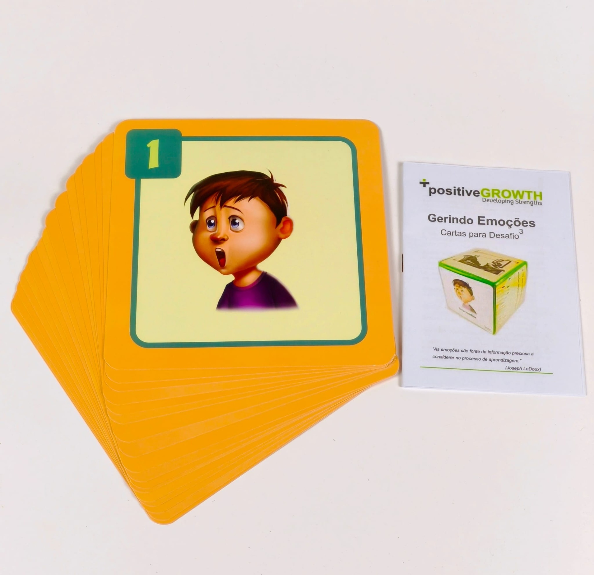 As Cartas Gerindo Emoções (com a dimensão 16,9 X 16,6 cm) são um conjunto de 18 cartas, impressas em ambos os lados, para usar com o Desafio ao Cubo.