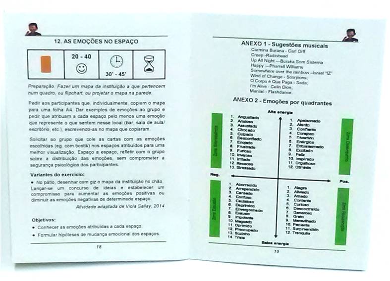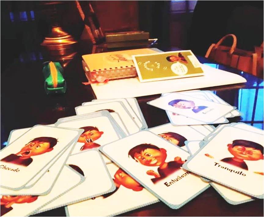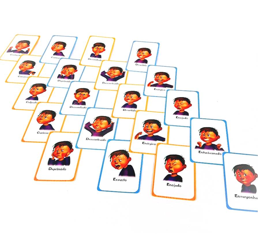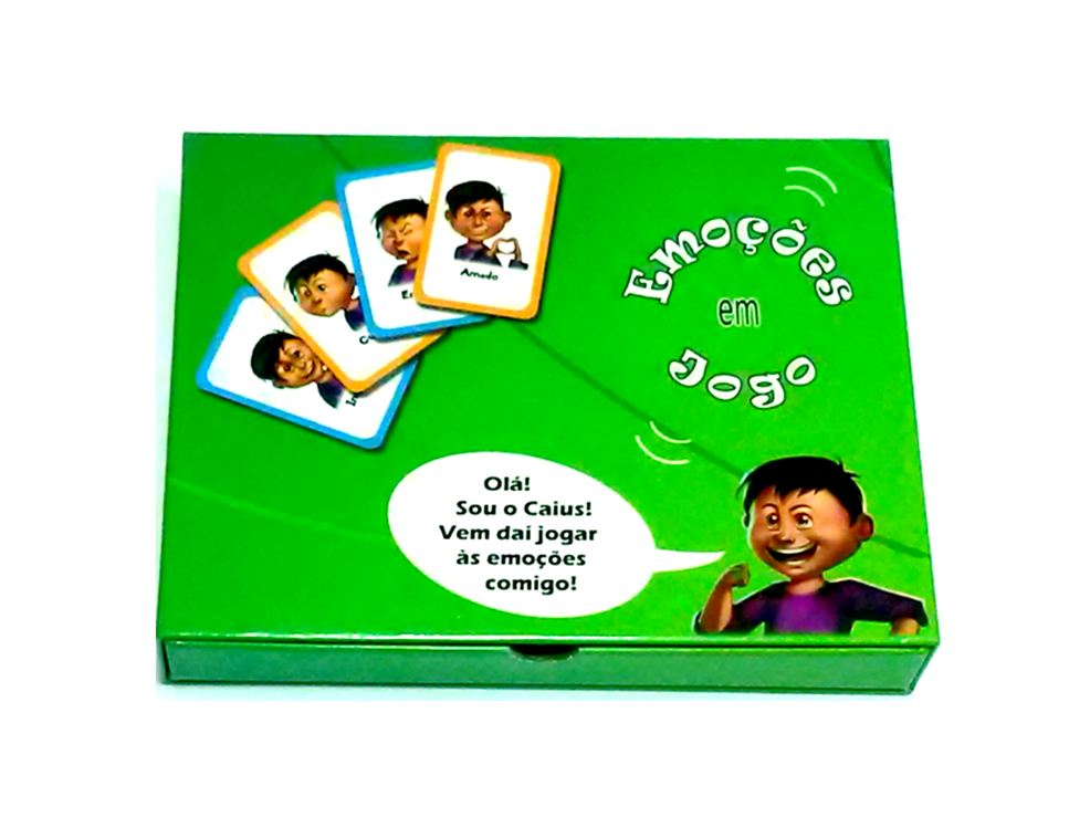 O Kit Emoções em Jogo” é composto por: 2 baralhos com 52 cartas (emoções) cada, onde cada carta representa uma emoção, e um manual que faz o enquadramento científico das emoções e sugere 12 exercícios distinto para as trabalhar.