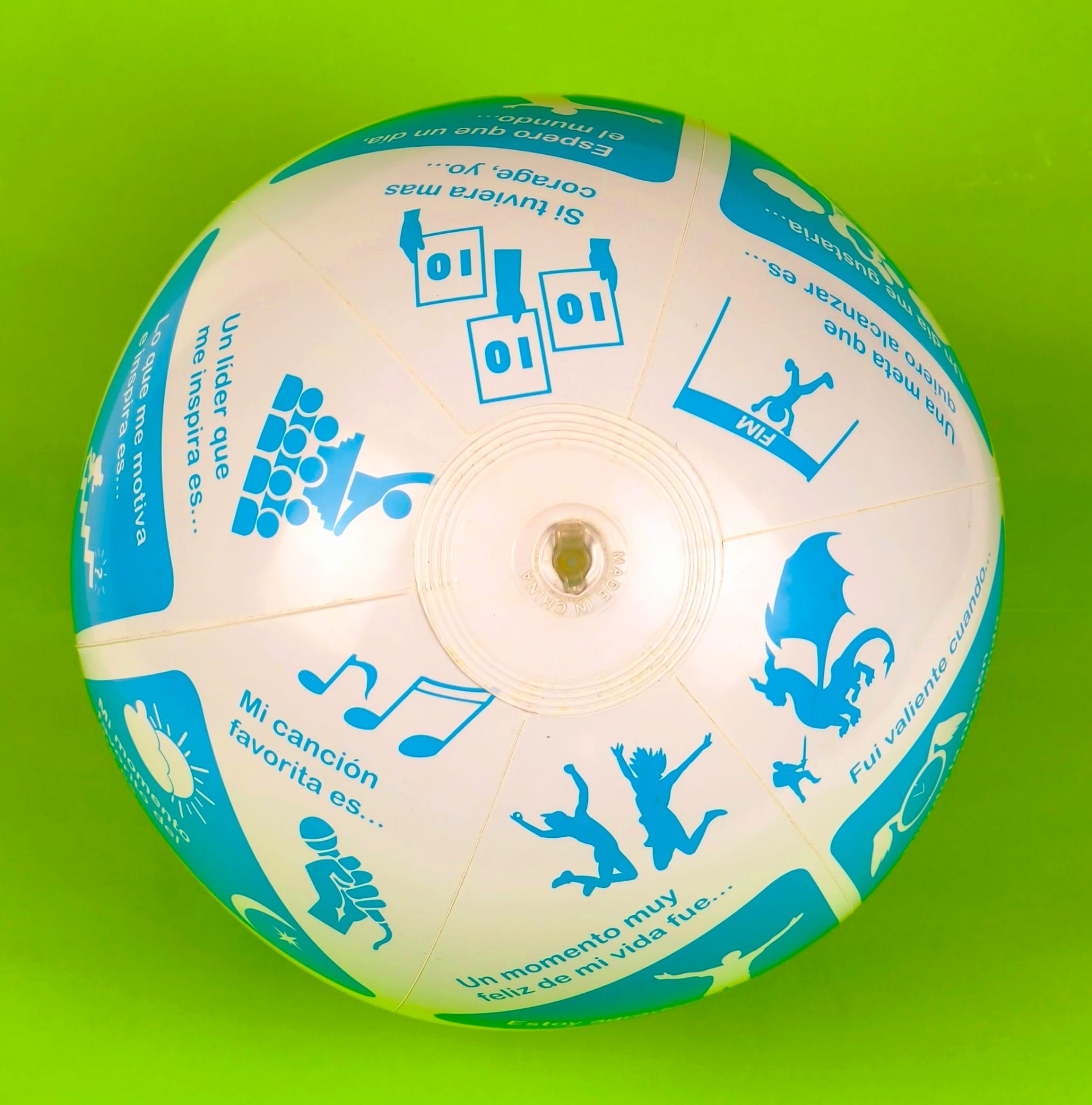 - Pelota con diámetro de 30cm de diámetro, con 30 frases impresas en su superficie;